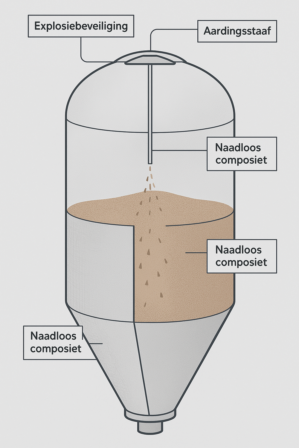 Een Polem silo of tank is naadloos, sterk en spiegelglad dankzij krachtig composiet. Immuun voor corrosie, beschermend ten opzichte van vocht en eenvoudiger in onderhoud dan traditionele materialen. Deze naadloze constructie is cruciaal voor explosieveiligheid, omdat er geen lasnaden of verbindingen zijn waar stof zich kan ophopen en ontstekingsbronnen kunnen ontstaan.