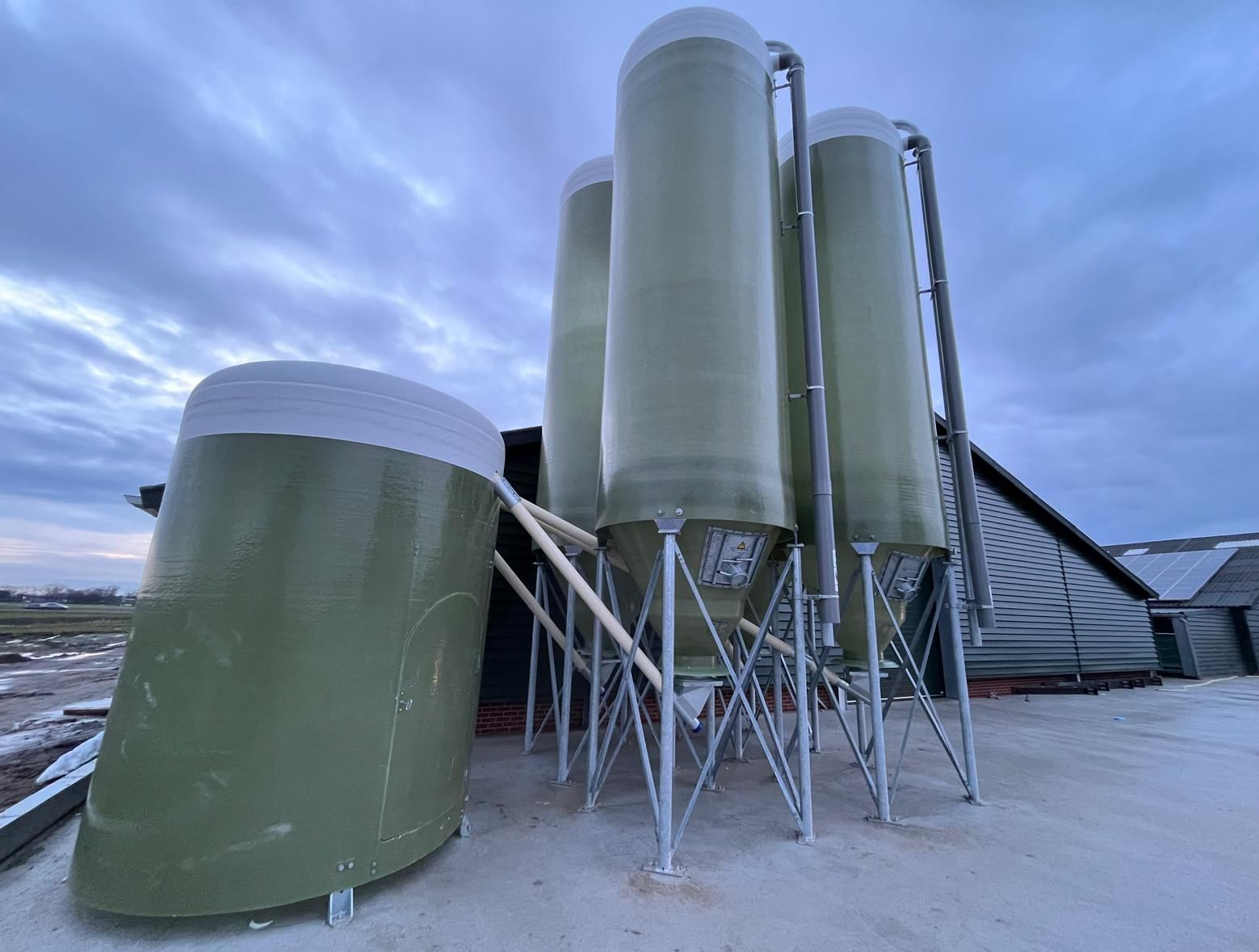 Vier Polem-silo’s met wegerhut voor vleeskuikenhouderij